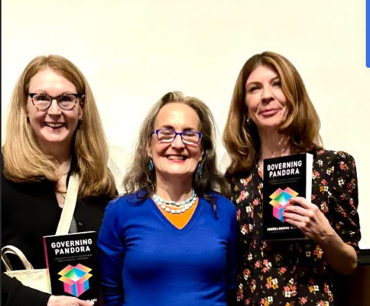 I had a delightful time at the launch of a new book on technology and governance, Governing Pandora this week and even got to have a fireside chat with the author, dear friend Andrea Bonime-Blanc. The book is for leaders and boards, and explores how governance needs to transform, now that exponential technology is here. We talked about broligarchs, bravery, and agency. Here we are afterwards, with another dear friend, Alice Korngold: