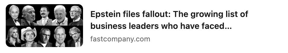Hollywood agent Casey Wasserman and the general counsel of Goldman Sachs, Kathryn Ruemmler have both resigned. So has Kimbal Musk, from the board of Burning Man (who knew there was such a thing).